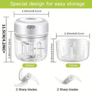 Effortlessly chop, grind, and mix with this portable electric garlic chopper, perfect for garlic, onions, ginger, chili, meat, and even baby food. Featuring a powerful 37W high-speed motor and 2 sharp 304 stainless steel blades, it delivers quick, uniform chopping in just seconds. The 1-cup capacity and wireless USB rechargeable 1200 mAh battery make it ideal for both home cooking and outdoor use. Built with food-grade PP material and a safety magnetic lock design, it ensures safe and hygienic operation by stopping the motor when the cover is removed. Easy to clean with detachable parts, this compact food processor is the ultimate kitchen gadget for fast meal prep.